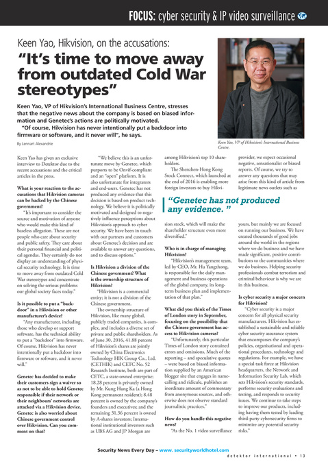 sion stock, which will make the shareholder structure even more diversified.” Who is in charge of managing Hikvision? “Hikvision’s management team, led by CEO, Mr. Hu Yangzhong, is responsible for the daily management and business operations of the global company, its longterm business plan and implementation of that plan.” What did you think of the Times of London story in September, focusing on the possibility that the Chinese government has access to Hikvision cameras? “Unfortunately, this particular Times of London story contained errors and omissions. Much of the reporting – and speculative quotes – were based on biased information supplied by an American blogger site that engages in namecalling and ridicule, publishes an inordinate amount of commentary from anonymous sources, and otherwise does not observe standard journalistic practices.” How do you handle this negative news? “As the No. 1 video surveillance yours, but mainly we are focused on running our business. We have created thousands of good jobs around the world in the regions where we do business and we have made significant, positive contributions to the communities where we do business. Helping security professionals combat terrorism and criminal behaviour is why we are in this business. Is cyber security a major concern for Hikvision? “Cyber security is a major concern for all physical security manufacturers. Hikvision has established a sustainable and reliable cyber security assurance system that encompasses the company’s policies, organisational and operational procedures, technology and regulations. For example, we have a special task force at Hikvision headquarters, the Network and Information Security Lab, which sets Hikvision’s security standards, performs security evaluations and testing, and responds to security issues. We continue to take steps to improve our products, including having them tested by leading third-party cybersecurity firms to minimize any potential security risks.”