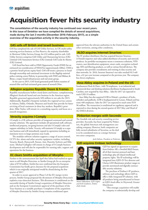The consolidation of the security industry has continued over recent years. In this issue of detektor we have compiled the details of several acquisitions, made during the last 3 months (December 2016–February 2017), as a simple overview of the acquisition activity in the security industry.