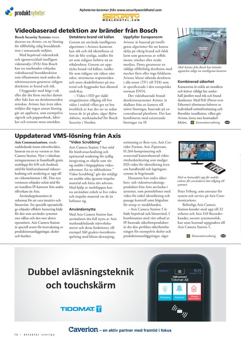 Bosch Security Systems introducerar nu Aviotec, en ny lösning för tillförlitlig tidig branddetektion i utmanande miljöer. Med beprövad videoteknik och egenutvecklad intelligent videoanalys (IVA) från Bosch kan nu marknaden erbjudas videobaserad branddetektion som tillsammans med andra detektionssystem genererar tidigare detektion av brand och rök. I byggnader med högt i tak eller där det finns mycket damm eller fukt kan nu detektionstiden minskas. Aviotec kan även säkra miljöer där ingen annan lösning går att applicera, som exempelvis sågverk och pappersbruk, fabriker och extremt stora områden. Detektera brand vid källan Genom att använda intelligenta algoritmer i Aviotec-kameran kan rök och eld identifieras så fort de blir synliga, istället för att som tidigare behöva nå en rökdetektor. Genom att upptäcka brand vid källan, istället för som tidigare när röken nått taket, minimeras responstiden och stora skadeförluster på material och byggnader kan därmed undvikas. – Video i HD ger räddningstjänsten tillgång till live video i realtid vilket ger en bra överblick av hur det ser ut redan innan de är på plats, säger Björn Adméus, marknadschef för Bosch Security i Norden. Uppfyller Europanorm Aviotec är baserad på intelligenta algoritmer för att kunna skilja på riktig brand och falsk larm som genereras av reflektioner, rörelser eller strakt motljus. Detta garanterar en väldigt tillförlitlig detektion med mycket färre eller inga falsklarm. Aviotec klarar sålunda detektera i alla tester (TF1 till TF8) som är specificerade i den europeiska normen EN54. Det videobaserade branddetektionssystemet Aviotec är skalbart från en kamera till större lösningar, baserade på en centraliserad plattform. Det kan kombineras med existerande lösningar via IP.
