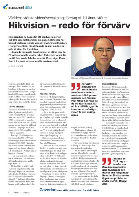 står internationell försäljning för 26,5 procent av den totala omsättningen. Redo för förvärv Hikvisions vd, Yangzhong Hu, som är en av de 28 personer som grundade företaget, talade till en grupp branschjournalister (bland annat Detektor) genom en tolk i Hangzhou i slutet av 2015. – En av de viktigaste anledningarna till att vi kan göra vad vi gör i dag beror på att den kinesiska ekonomin har varit mycket stark under det senaste decenniet. Det ger oss en mycket stark grund och vi har haft tur att ha denna starka bas. Vi är också lyckligt lottade som har så många ingenjörer i Kina, säger Yangzhong Hu. Han uppmanades också att kommentera Canons förvärv av Axis och Milestone. – Det kom lite som en chock för alla i branschen, men på larmmarkanden ägde det tidigt rum några större förvärv och nu ligger fokus på CCTV. För Hikvision har det alltid funnits tre element: teknik, marknadsföring samt fusioner och förvärv. Vårt fokus har varit på de två första men när ett bra tillfälle uppstår kommer vi naturligtvis att ta den möjligheten. Yangzhong Hu anser att efterfrågan på säkerhet och trygghet driver marknaden men betonar också att videoövervakningens natur har förändrats från övervak-