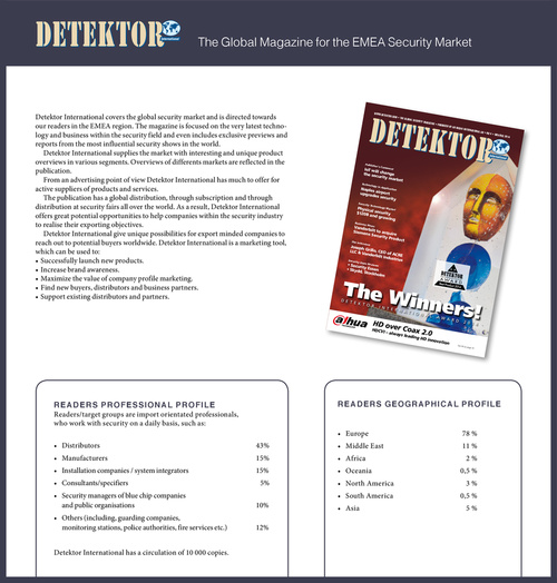 Detektor International covers the global security market and is directed towards our readers in the EMEA region. The magazine is focused on the very latest technology and business within the security field and even includes exclusive previews and reports from the most influential security shows in the world. Detektor International supplies the market with interesting and unique product overviews in various segments. Overviews of differents markets are reflected in the publication. From an advertising point of view Detektor International has much to offer for active suppliers of products and services. The publication has a global distribution, through subscription and through distribution at security fairs all over the world. As a result, Detektor International offers great potential opportunities to help companies within the security industry to realise their exporting objectives. Detektor International give unique possibilities for export minded companies to reach out to potential buyers worldwide. Detektor International is a marketing tool, which can be used to: • Successfully launch new products. • Increase brand awareness. • Maximize the value of company profile marketing. • Find new buyers, distributors and business partners. • Support existing distributors and partners.