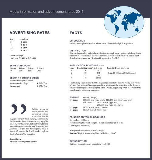 CIRCULATION 10 000 copies (plus more than 35 000 subscribers of the digital magazine). DISTRIBUTION The publication has a global distribution, through subscription and through distribution at security fairs all over the world. For information about the current distribution, please see “Readers Geographical Profile”. PUBLICATION SCHEDULE 2015 Issue Publishing week* AD copy 1 9 29/1 2 18 1/4 3 37 18/8 4 48 26/10